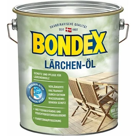 Huile de mélèze 4,00 l de Bondex, avec le n° d’art. : 329619 et le numéro EAN : 5702160208436 Pour tous les bois de jardin tels que terrasses, meubles, pergolas, écrans d’intimité, etc. ; Protection optimale contre les intempéries et les UV ; Réduit les fissures et protège le bois contre le dessèchement