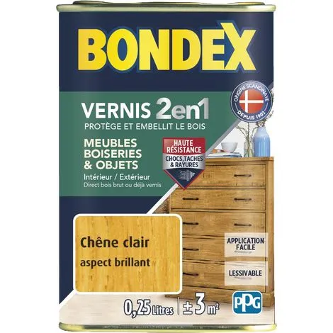 Vernis bois 2 en 1 : ProtĂšge et embellit le bois. Pour meubles, boiseries et objets.IntĂ©rieur ou extĂ©rieurTous bois et dĂ©rivĂ©s : meubles, portes, fenĂȘtres, charpentes…Direct sur bois brut ou dĂ©jĂ vernisFormule enrichie en rĂ©sine alkyde urĂ©thaneProtĂšge efficacement de l’eau et de l’humiditĂ©Haute rĂ©sistance aux chocs, taches et rayuresApplication facileTrĂšs haut tenduLessivableRendement : 0,25L = Environ 3mÂČ Contenance : 0,25LAspect : BrillantConsommation : 12 mÂČ/L